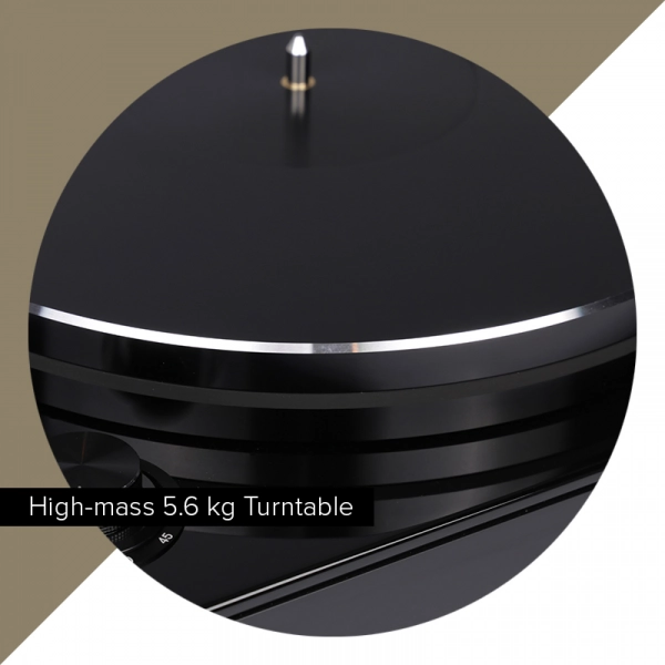 A belt-driven platter weighing 5.6 kg supported on a complex bearing is paired with a servo-controlled motor for exceptional refinement.